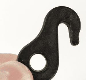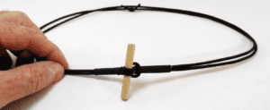A plastic hook with a hole in one or two holes in the other end. If one hole, make a loop through it. If two holes, an adjustable lacing method applies.