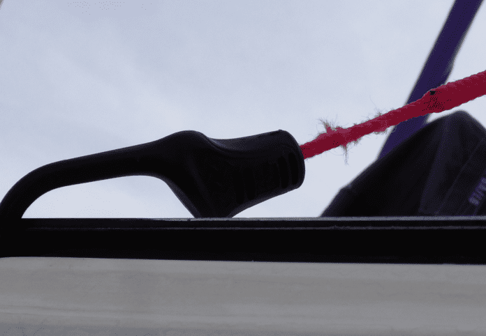 4. Self-locking hooks from Sailrite. These both came off, without warning, at about the maximum working load of the bungee. We do not consider these safe option.