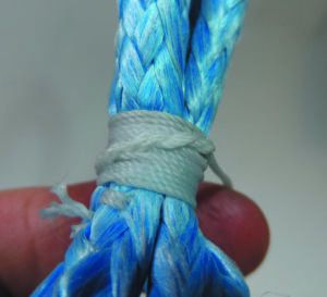 10. Seize the throat under the spacer, close enough that the rope cannot slip between the spacer and the edges of the LFR. This is best done with a string of at least 8 half hitches, burying the tail with several pass through stitches when finished. Number 8 whipping twine is appropriate for ¼-inch Dyneema (see photos 1 & 3).