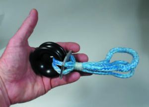 LFR textile blocks reduce friction by re-orienting the ring. Instead of leading the rope through the “donut hole” in the low friction ring, the rope is led around a groove in the outside. To keep the line in the groove, a spacer block is secured by a length of Dyneema which also serves as the “axle” for the LFR (see photo 6 on page 8).