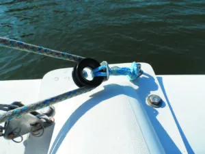 Leading all of the halyards to the cockpit is a convenience, and in many cases a safety improvement, but this involves several 90 degrees turns, so we must minimize friction every chance we get. (We like halyards at the mast too; it’s easier to hoist a heady sail by simply hanging your weight on a halyard than grinding a winch that has been through several turning blocks.)