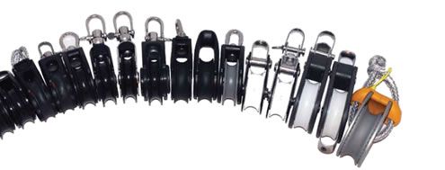 Options include a block with no shackle; a lashable, molded model; or a pinned-together conventional swivel design. The swivel version also has a neat removable, molded insert that slips over the shackle clevis and locks the shackle in one plane, moving only when it is advantageous to do so.