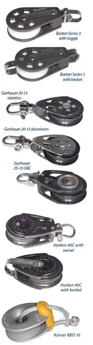 This round of testing included a look at products from Barton, Garhauer, Harken, Karver, Holt, Ronstan, Schaefer, and Seldn. All of the units tested were ball- and/or roller-bearing designs, and the trend toward more composite material and less metal was evident.