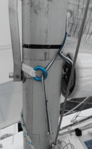 1. Cunningham deflector. The test boat is rigged with roller boom furling, and so there is no positive attachment from the tack to the mast. The outhaul pulls the foot of the sail away from the mast, damaging the luff tape unless there is a firm forward pull on the tack, Cunningham, or reefing grommet. We use a strop around the mast, fitted with a rappel ring on either side, to deflect the Cunningham line forward, pulling the tack forward (see “Getting the most out of Older Sails,” PS January 2022). Previously, we used low friction rings, which worked, but were difficult to thread and dug into the mast. The rap rings are easier to thread (bigger hole and more to hold on to) and lie smoothly against the mast. Chafe tape protects the mast (see “Chafe Tape Plan,“ PS December 2020.)