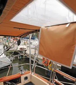 1. Wide cockpit, modern designs vastly increase Bimini and dodger surface area. Multiple support bows are needed. Windows in the overhead must provide good visibility for sail setting, reefing, and trimming on all points of sail.