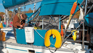 It’s clear that sailing in a big tent has its ups and downs. But there are some caveats. Number one is what happens offshore when you encounter a run-of-the-mill gale with 35-40 knot winds and 15-to-20-foot breaking seas? The teepee like structure in the cockpit may survive the wind, but water is 400 times more dense than air and a swimming pool’s volume of sea water dropping onto the tube and fabric enclosure won’t go unnoticed.