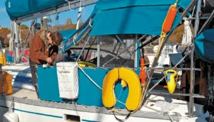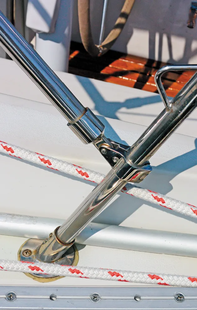 The venerable companionway dodger is still a cruising sailor’s best friend. Its strategic role includes allowing the main hatch to remain open, even when rain is pouring down and you’re beating to windward in a blow. Its stainless steel, bow-like, arched framework and secure mounts allow it to be folded forward or pivoted up into position. When combined with a spray hood—a garage-like shelter that the main hatch slides into, a dodger can keep the companionway ladder and accommodations below quite dry, even when the spray is flying.