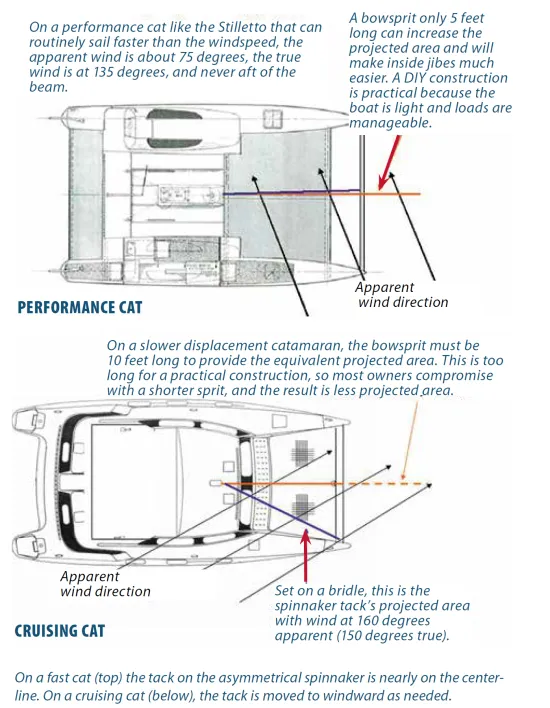 Multihulls don’t fly chutes deep downwind. They reach. But there are shades of meaning in that and some half truths spread about cruising cats. Four decades ago I mounted a long sprit on my beach cat, and she went like mad. My next boat, a Stiletto catamaran, A Kevlar honeycomb speedster, carried a chute on a sprit.