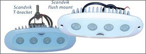 The two Scandvik lights we tested-one flush-mount, one bracket mount-are both well-made, well-engineered lamps that employ an inline four-LED design. Their illumination is excellent. When compared with lamps containing quartz-halogen bulbs, Scandviks deck lights deliver equivalent brightness and a radius of illumination at about 20-percent of the formers power usage. We measured a 0.6-amp current demand at 12.6 volts DC and were pleased by the wide circular beam. Initially, we assumed that there would be more of an ellipse shape beam, but by optically setting up the lens and LED configuration, the inline housing still delivers a circular beam.