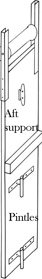 The crosspiece mounted above the pintles is merely a spacer placed so as to fit firmly against the boat’s sheerline rubrail when the mast support is in position. It keeps the whole assembly from twisting or pivoting off center. I used a short piece of 2 x 4.