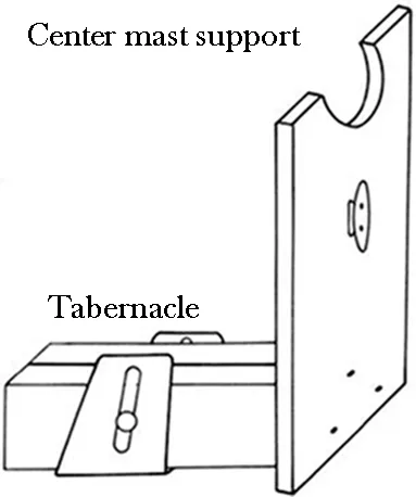 The center mast support is made to fit in the mast tabernacle. I used two 2 x 4’s nailed together to form the horizontal piece. You may have to plane them down slightly to fit in your mast step. They need not be much more than about a foot long. Adjust the length so as not to interfere with any obstructions on deck. Drill a hole through the horizontal piece the diameter of the hinge pin in the mast tabernacle.