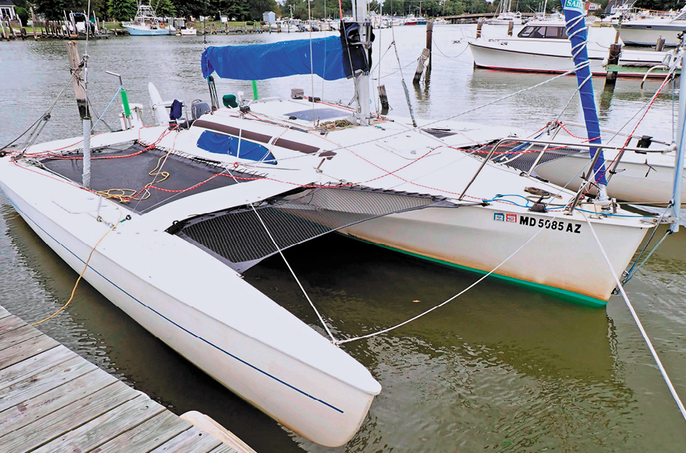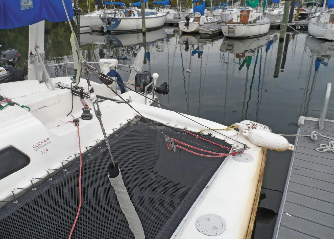 Folding trimarans like the Corsair often have large gaps between the tramp and the boat to allow the amas to be folded and extended. To close the gaps on our F-24, we laced on mini-tramps made from material used for beach catamaran trampolines. Because these mini-tramps lace under the cross beam rather than directly to the beam, they can be left in place while folding the amas.