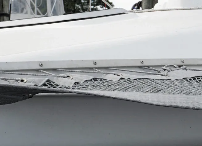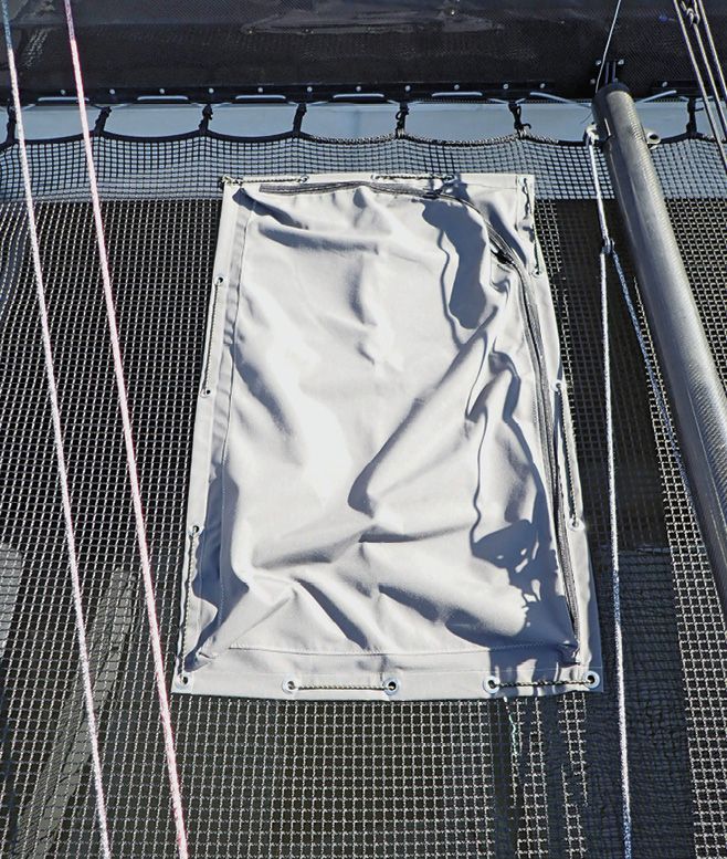 Nets made from webbing are the most durable, but they are expensive, heavy, and not very comfortable. Lifeline netting is also a poor choice; most types fall apart in just a few years. Better to have no netting than netting you can’t trust. High quality net material might make sense for the bow section of a trimaran where a very open weave is required, but it will need to be reinforced with grommets and installed in small sections.