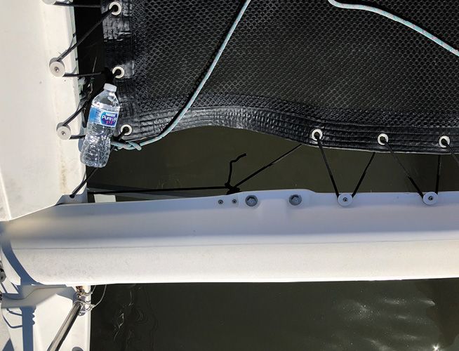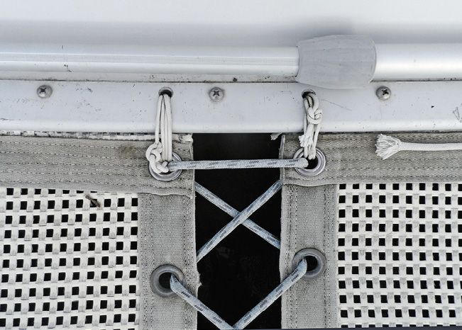 The bolt-rope track can also be paired with plastic sliders, just as you see on mainsail luffs. Black sliders resist UV better than white, and we prefer them with metal bails. The nice thing about using a bolt-rope track is that when you replace the trampoline, you don’t have to coordinate the grommets on the new tramp with the attachment points on the hull.