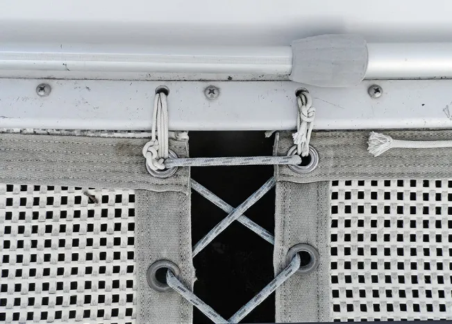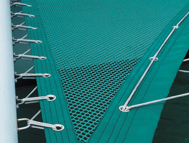 Alternatively, a bolt rope can be sewn along the edge of the trampoline so that it fits into a grooved track on the hull. This eliminates gaps along the edge and gives the trampoline a clean look. In high traffic areas, however, flexing and abrasion is concentrated along the edge, making it more susceptible to wear. We’ve seen several tramps fail along the bolt rope. Additionally, the bolt rope often pulls out of the groove at the corners where loads concentrate. One way to prevent this is to add corner grommets that can be laced to the hull.