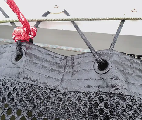 Halyard and sheet bags. Bags can be handy on bow and wing nets for the tails of halyards and sheets. Although the bag can be sewn to the tramp during manufacture, it is often better to either lace the bag to the tramp through the mesh, or install grommets and lash the bag to those. The problem with sewing the bag directly to the tramp is that trampolines stretch in use, and sewing on a bag creates a stiffer hard spot, resulting in stress at the corners, leading to tears. It is better if the tramp can move separately from the bag. Alternatively, you can do as we did, and reinforce the trampoline with a second layer with rounded corners before adding the bag.