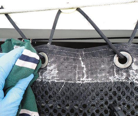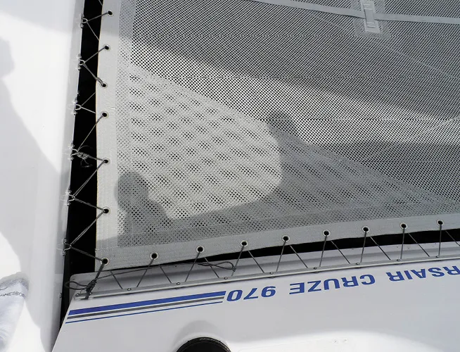 We saw no need to paint both sides of the woven mesh we tested; the paint ran around the mesh and soaked in evenly. A more solid net, like the one on our former boat, a PDQ 34, might benefit from a light coating on the underside. The coating did not affect the trampoline tension. No lacing adjustments were required.