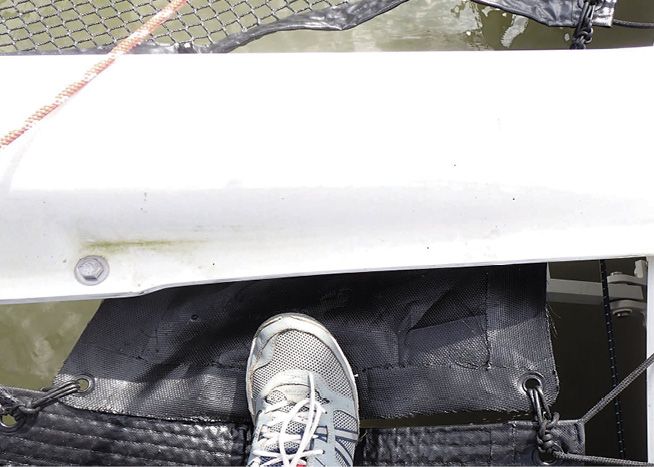 Add additional lashing points as needed. The tramp manufacturer may recommend a minimum spacing of about 6 inches, but if your foot can fit through any gap, it’s too big. Adding grommets means adding more attachment points on the boat. We’ve added grommets to most of our tramps, either for strength or to eliminate hazards. The additional bits of hardware (and required holes) are worth the effort to prevent injury. We’ve gone through gaps several times, and it hurts, sometimes a whole lot.