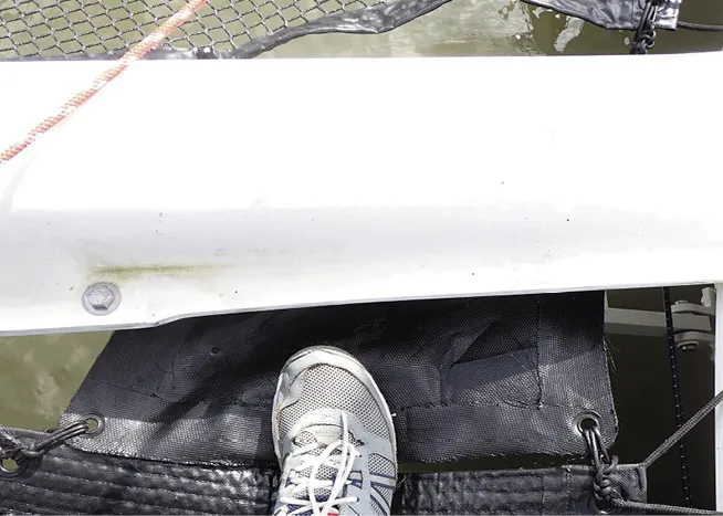 The bow nets of a trimaran have maximum free area (gaps between lacing) to allow the rapid passage of wind and water. The downside of nets with larger holes is that they are uncomfortable when lounging or walking on them with bare feet. Fingers and toes can get caught. The wing nets on a trimaran are located amidship, and typically have less free area, since they will see more traffic. There must still be enough free area for water to pass through, and they must still be made of a lightweight material.