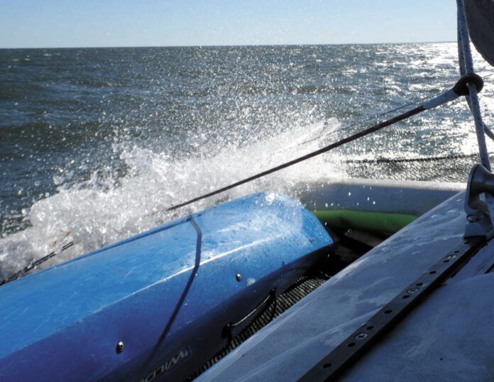 If you decide to add more lashing points, you have a couple of options. Most people just drill holes for new hardware, filling core as needed. If you are adding aluminum track for a tramp with a boltrope, you could try to bond it to the hull, but it will likely fail because aluminum and fiberglass have different expansion properties, which will add stress to the bond. If you don’t want to drill holes in your hull, you can bond a strip of solid ¼-inch prelaminated fiberglass and drill that.