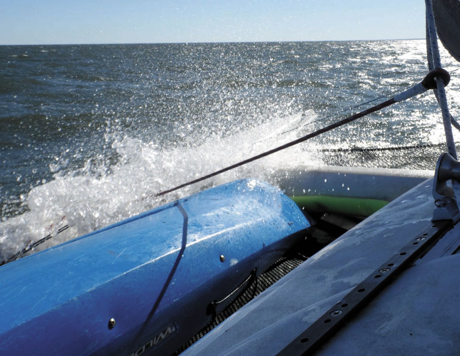 When sizing your lacing, remember that diameter of the line relates to the size of the tramp, not the size of the boat. The boat manufacturer, as well as the tramp maker should help guide you to the ideal diameter. The diameter will depend on how much stretch you want, and that will depend on the tramp material. Our Corsair F-24 uses ³/₁₆-inch (4 mm) Dyneema single braid or ¼-inch (5mm) polyester double braid. Our previous test boat, a PDQ 32, used ⁵/₁₆-inch polyester double braid.