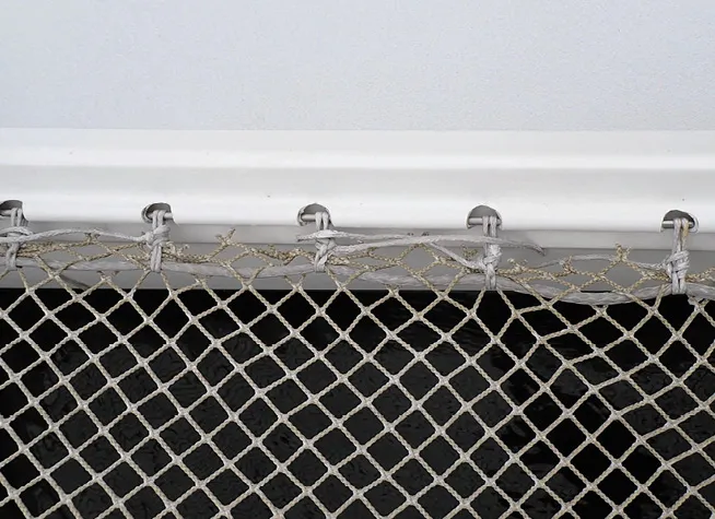Replacing nets on the water, particularly those that lace down the middle, requires installing and partially tensioning the new lacings just a few holes behind the old lacing as you remove it. Keep your weight back from the lacing a little bit and minimize the gap. A pair of vice grips on the lacings (old and new) can keep them from pulling out as you work.