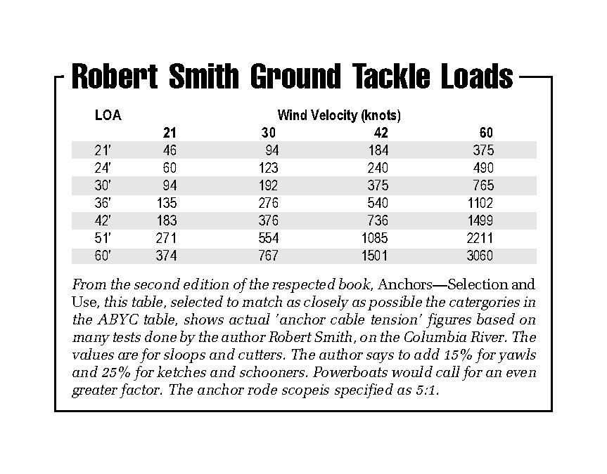In sharp contrast to the ABYC data is the data published in the table of the third edition of Robert Smith’s 1983 book called Anchors—Selection and Use (see table at end of article).