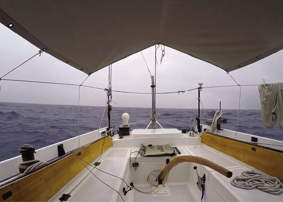 The sailing awning takes less than three minutes to erect. There are no battens. We tie the front end to the boom gallows frame and the aft end to the back stay. The sides are tied off with short lanyards to the lifeline with rolling hitches. We can move it to one side or the other as well as position it forward or aft depending on the location of the sun to provide the best shade for the cockpit.