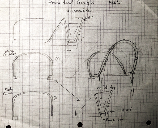 I examined ways to modify our existing hood by adding a second bow. I took it to a trusted canvas shop and they thought it would be difficult to make the kinds of mods I wanted and still make it foldable. Because I liked the pram-hood concept and was generally pleased with our hood, despite its few limitations, I began thinking about a slightly larger more robust foldable design with windows but still easily removable.