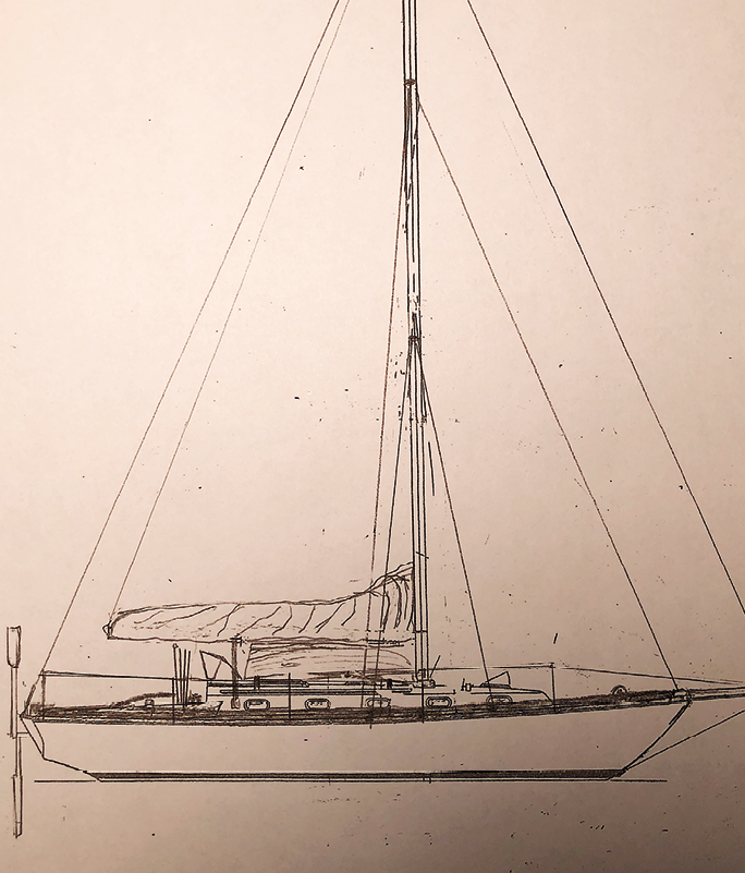 2. A profile sketch of the author’s Cape Dory 36, Far Reach, shows how the new pram-hood would appear in a profile view of the boat.