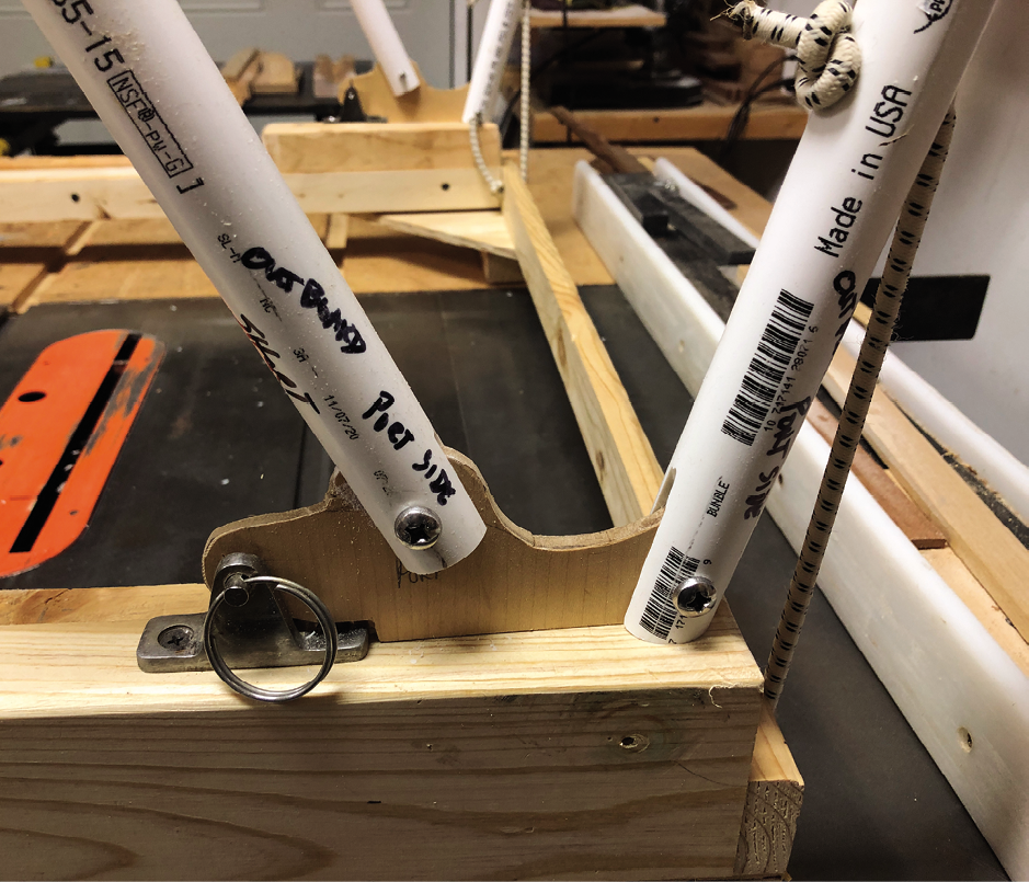To make fabrication of the hood easier and to better understand my design requirements, the next step was to make an accurate wood mock-up of our companionway opening. After building the mock-up and carefully confirming the measurements, I used the design drawing to fabricate a simple PVC tube pram-hood frame. I used scraps of plywood to make crude hinges so the hood could fold forward.