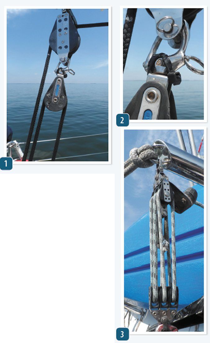 Double and Triple Blocks. If these are rigged for 4:1 purchase or 6:1 purchase, the problem is nearly always square rigging. An imbalance in forces due to bearing friction, line friction, and sometimes an offset pull on the final exit twists the blocks, cause the ropes to rub and the lines to run crooked in their pulleys. The solution is cross-reeving. Instead of following common sense, winding the lines from right to left in square pattern, lay the blocks at 90 degrees. (See photo #3)