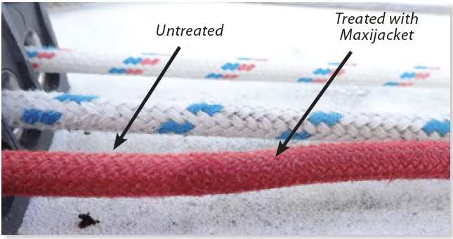 Made by Yale Cordage, Maxijacket is a quick-drying, waterborne polyurethane coating. It soaks in deeply and stiffens the line considerably. However, the 10-fold improvement in chafe resistance against both wood and grindstone was very impressive.