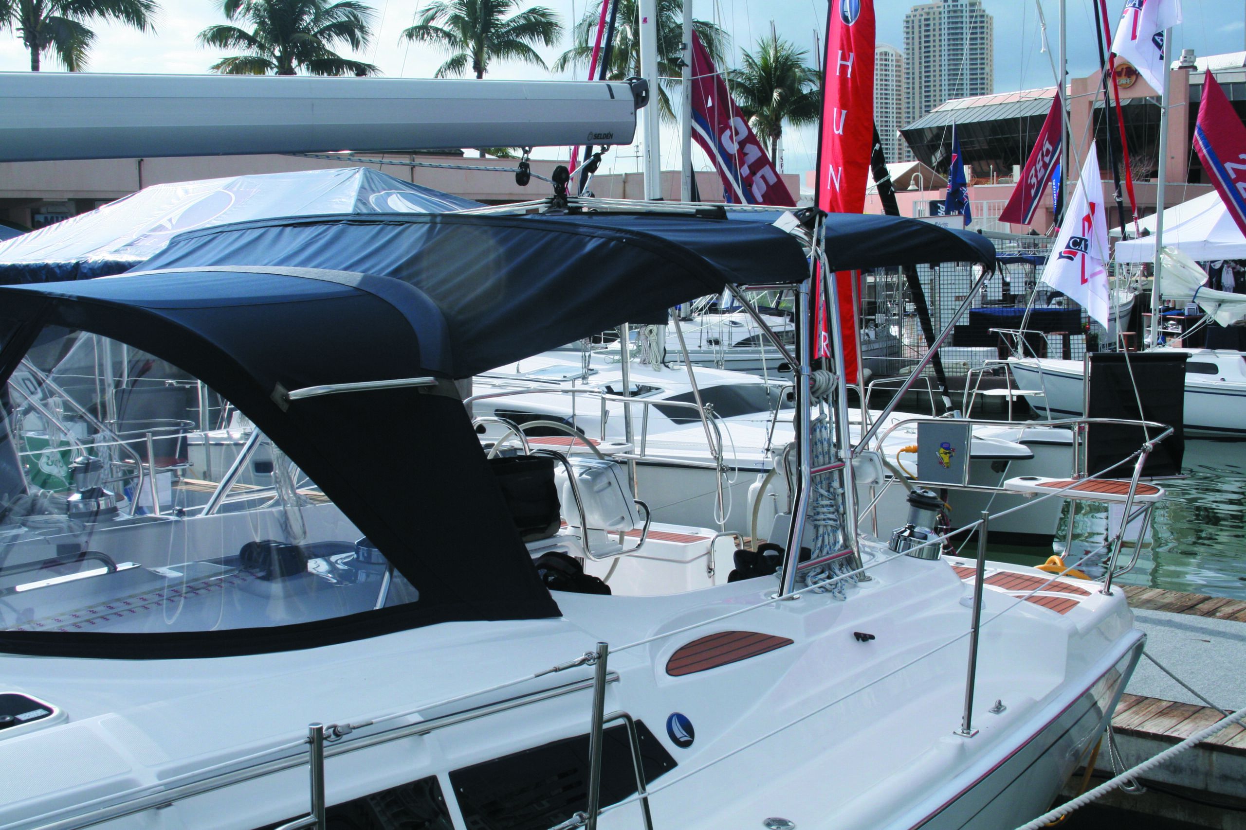 For most canvas work, such as dodgers, sheet bags, and window covers, we recommend darker colors because they last longer and hide dirt better. But for awnings and biminis the difference in heating swings the needle towards offwhite shades. We’re still looking for that miracle fabric that is low stretch, durable in the sun, flexible, reflective, and opaque.