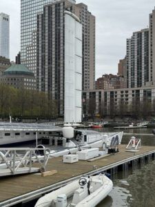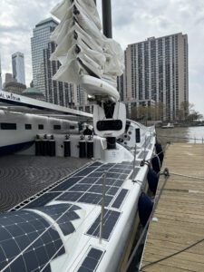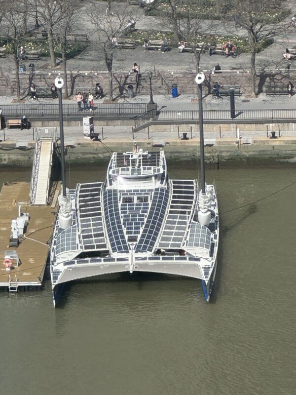 She turned heads recently when she sauntered into the North Cove on Battery Park City, a small piece of Manhattan real estate tucked into the borough’s southwest corner. Naturally attuned to the waterfront, Practical Sailor was drawn initially to that ecstatic profusion of solar panels this unusual craft displays on virtually every square centimeter of deck surface. We learned Energy Observer’s solar arrangement is capable of generating 35 kilowatts of electricity to feed the ship’s lithium battery banks.