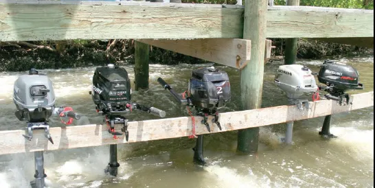 The test site was a saltwater basin just south of Tampa Bay, Fla. We used a friends waterfront dock as a staging ground for the test. Testers fixed a 2-inch by 8-inch board be-tween two of the docks pilings, so all five engines could be mounted side by side. We examined all components and critical access areas, including oil fill and oil dip stick, carrying handles, tillers, throttles, forward/reverse shifts, cowlings and their clips and fasteners, and ease of tilting, etc. Testers then moved the engines to a second 2 x 8 mounted just a few feet above the water (pictured above). There, the engines were started and run through part of their break-in periods. Testers also evaluated ease of starting at this point.