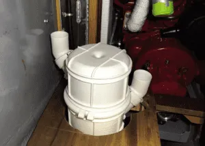 A waterlift muffler is an important part of the system. A waterlift muffler collects the sea water after it passes through the exhaust elbow mixed with exhausted gases. The water collects in the muffler but is forced out the of the muffler and along the exhaust hose and out of the boat by the pressure of the exhaust gases building in the muffler.