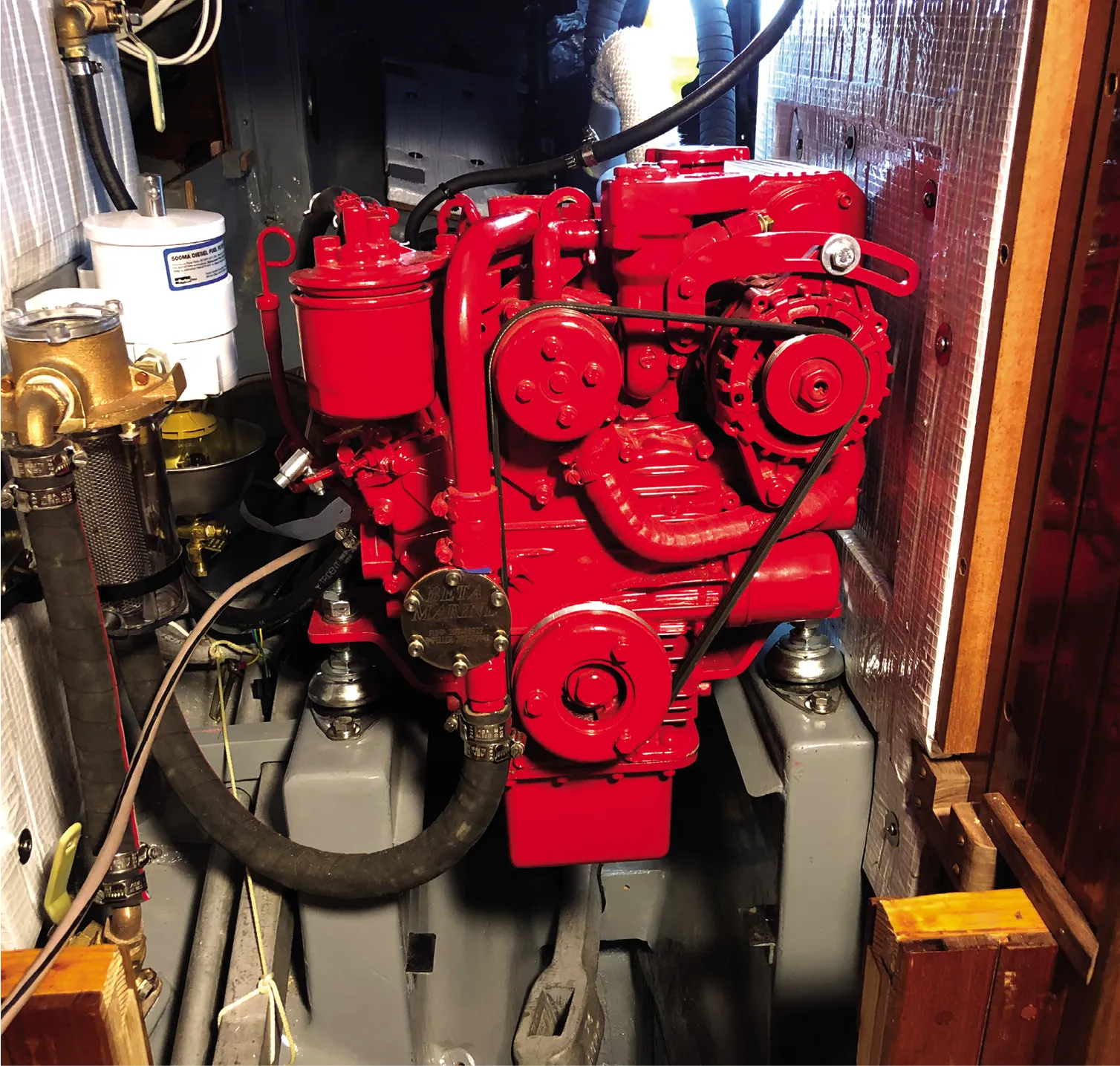 Before I installed the engine, I installed the fuel system to include a Racor filter and the raw-water intake. I painted all the fiberglass work in the engine compartment with Interlux grey Bilge-kote and then installed 1-inch thick Sound-Down to reduce engine noise and vibration.