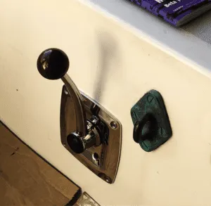 The Vetus SISCO side-mount, single-lever, 316 SS throttle control seemed like the best-made throttle control unit available. The forward end of the cockpit was the best location ergonomically when under power but when sailing, the handle would surely get tangled in the jib and mainsheets. Thus, I installed it toward the after end of the cockpit where it was easily within reach of the helm, but out of the way when sailing. The controller uses two cables: one runs to the throttle lever on the engine and the other to the transmission. After determining the required length of the control cables I visited a local marine consignment shop. Unbelievably, they had two in-the-box cables of the exact length I needed and approved for use on the cross parts list provided with the Vetus controller. I paid $20 each.