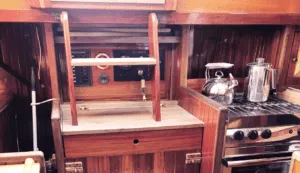 To accommodate the engine I needed to make a few changes to the cabinetry around the companionway ladder. I lengthened the starboard side fore-and-aft bulkhead which served as the side of the engine box using V-groove varnished mahogany finish to make it all blend in with the rest of the interior. I extended the workbench top about 14 inches along with its pull-out drawer. I modified the kickplate at the base of the companionway so it could be removed for a better engine access. The biggest change was to cut down the mahogany and teak companionway ladder to use the top of the work bench/engine box as the second step down from the companionway.