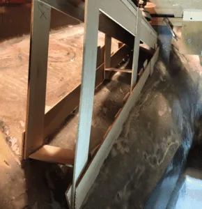 I brought the port side bed back to my workshop and applied biaxial cloth to the outboard side since it would be flush with the fore-and-aft bulkhead when installed. After the fiberglass cured, I took it back to the boat, and with the string still perfectly aligned, I used thickened epoxy to glue the beds to the hull held in place by the engine template. I let them cure overnight.