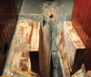 4. Large batches of epoxy thickened with colloidal silica were squirted into gaps around the stern tube to fix it in place. Peel-ply laminate left a smooth finish.