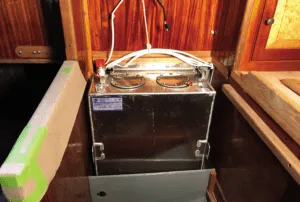 For five years I sailed with a single 100 AH Lifeline AGM battery charged only through a 30-watt solar panel. It worked well. But with the new engine I also decided to replace my tried-and-true kerosene navigation lamps with LED lights. Thus, I decided to increase the size of the battery bank and solar panels though still keeping the solar panels on flexible 10-foot power cords, allowing the panels to be easily moved around on deck to keep them in the sun. I chose T105 Trojan 6-volt, wet-cell batteries wired in series for 12V due to their legendary performance, low cost, and ability to be charged with an inexpensive easy to replace automotive style alternator standard on the Beta engine. For solar panels I chose two Zamp Obsidian Series 45-watt low profile glass panels. I mounted them to ¼-inch acrylic backing plates I purchased from McMaster Carr so I could secure them with lanyards to the inverted dinghy or other locations on deck to keep them in the sun.