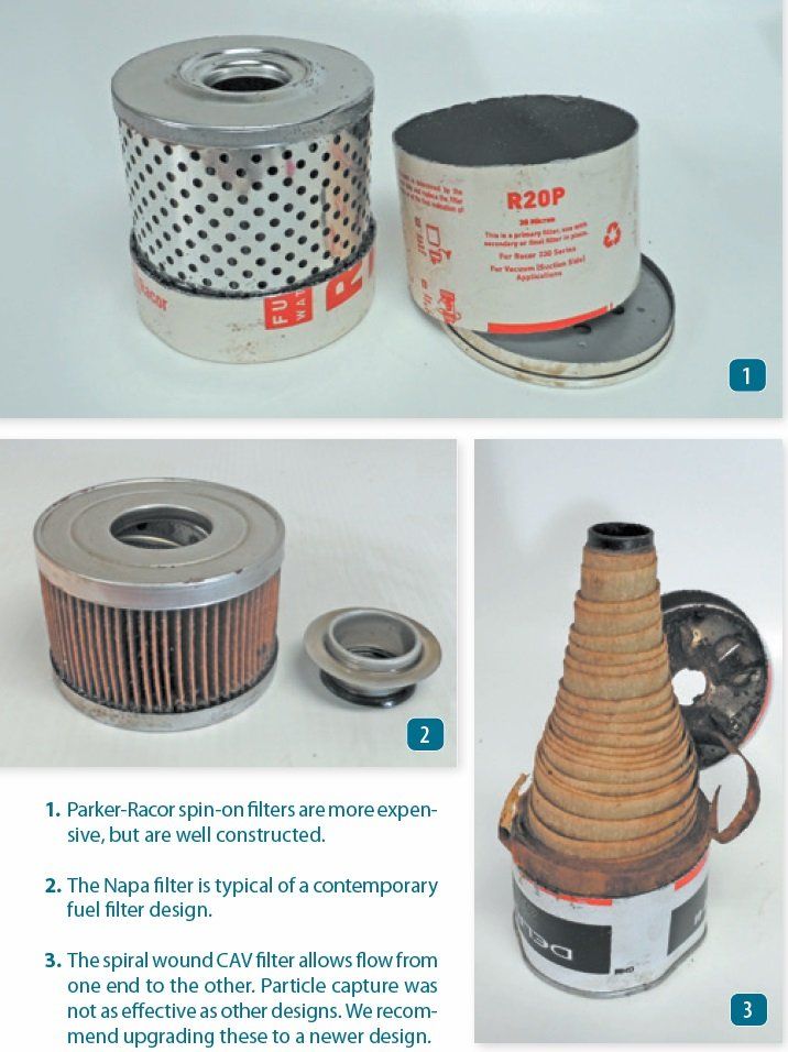 Volvo Penta (part number 3581078-7) and Fleetguard (FF167A) make canisters for the CAV housings. Although we did not test these, from what we see they use the same filter-first flow pattern and the same spiral depth winding, so we can’t recommend them. They may be better made than the ones we tested. Nevertheless, our advice is to swap filters that use the CAV spiral design for a more modern design.