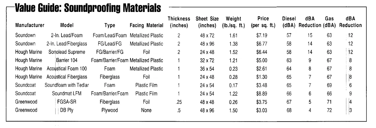 If all youre looking for is the maximum in noise control, Soundown 1″ Lead/Foam is your choice, though not by much. Hough Marines Sonovinyl Supreme performed as well for a gas engine, almost as well for diesel, and costs less. If youre concerned about fire protection, Soundown 2″ Lead/Fiberglass will provide comparable performance combined with fire retardance at a comparable price. You wont be able to glue it, however.