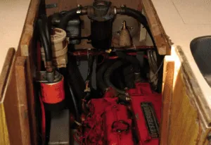 The design also incorporates “doors” around the shaft to reduce the amount of water that can enter the self-draining engine compartment when sailing offshore. It is a unique and capable design providing an inexpensive but capable power option for small cruising boats yet eliminates many liabilities associated with inboard diesel engines.