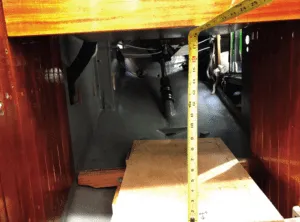 Another part of the geometry equation to solve was how low the engine could be positioned in the boat while achieving the lower shaft position. Because the hull narrows below the engine, the lower the engine was positioned, the farther forward it would need to be located. If it was mounted too far forward,the engine would project into the saloon and interfere with the positioning of the companionway ladder. If I raised the engine too high, I would not be able to get the prop deep enough in the water.