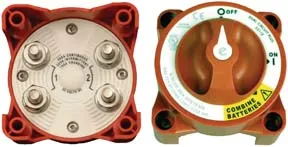 Rated for 300 amps continuous and 525 amps intermittent, the 5511 Series E switch has many of the construction details found in the heavy-duty switch. Its chief purpose is to serve as a foolproof replacement for the conventional four-way (Off-1-2-Both) switch. In essence, it is a simple on-off switch with a third emergency “Combine” position (clearly marked with a yellow warning label). In the “On” position, both banks are completely isolated and connected to their dedicated loads—starter and house. Isolation not only prevents a bad house bank from discharging your start battery, but it also eliminates the risk of power spikes that might cripple sensitive electronics.