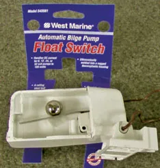 The West Marine Automatic Float Switch (part #543561) uses a steel ball that rolls up and down a channeled pocket inside of the float’s hollow arm. As the float arm tips up in the water, the ball rolls to the back of the arm and the ball’s weight closes a micro switch. If you secure the lead wires too tightly near the switch, you could restrict the float’s ability to pivot. During surge testing, the weight of the ball did a good job keeping the float arm from popping up prematurely.