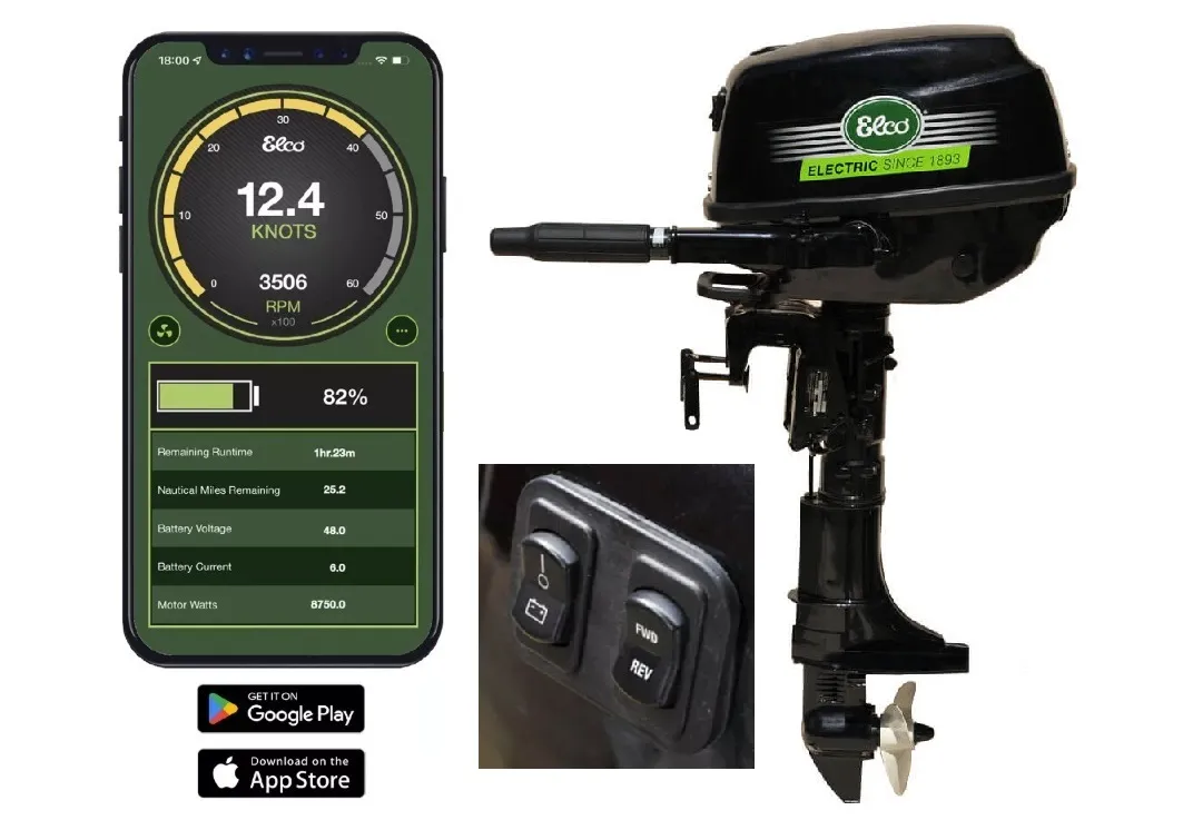 Description: Elco has offered electric-powered boats since 1893. The latest EP outboards were introduced in 2013. The EP-9.9, Which is water cooled and uses a conventional impeller pump, is suitable for sailboats up to 25 feet or 2,500 pounds. Elco outboards use third-party batteries. Elco smartphone/tablet-based Dash app calculates remaining runtime in hours and nautical miles ($345 Bluetooth connector required). NMEA 2000 connector available.